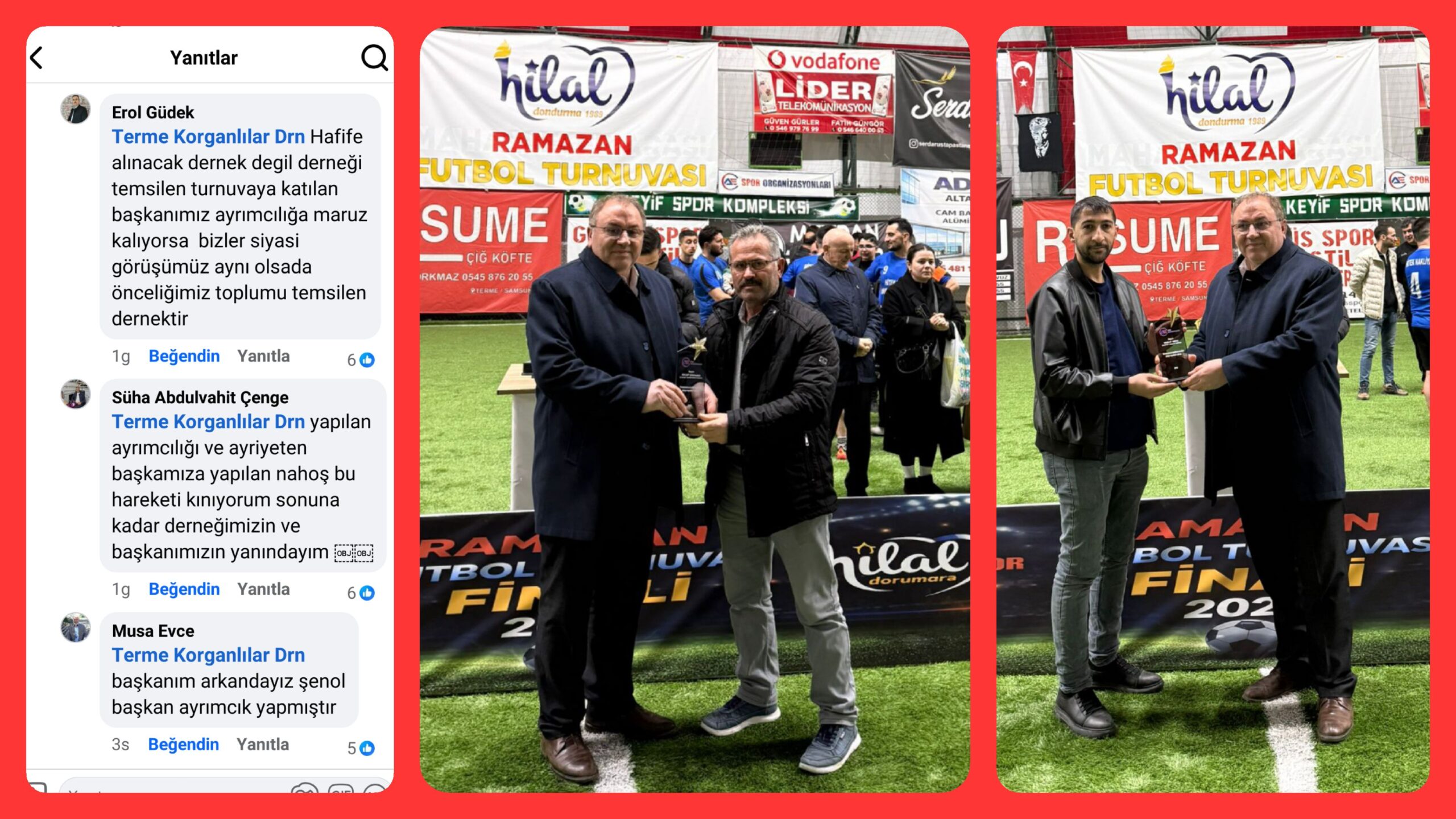Dernek tarafından yapılan açıklamada, turnuvayı organize eden Ahmet Çırak ve Emrah Çağlar’a teşekkür edilirken, kazanan takım da tebrik edildi. Ancak paylaşımda, dernek başkanı Rıza Evce’nin ve bazı sivil toplum kuruluşu temsilcilerinin fotoğraflarda yer almamasına tepki gösterildi.